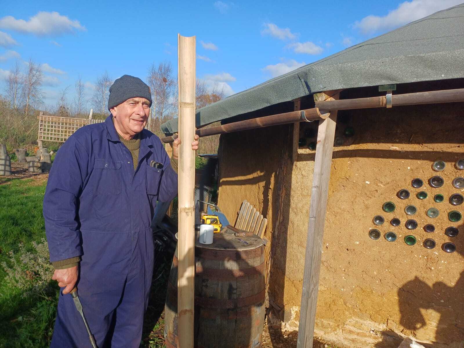 We have now begun work on the bamboo gutters at the Hub, and we’ve been fortunate to meet Malcolm, who has offered to assist with the project. Malcolm has kindly donated his time and some metal he had to design the brackets for the bamboo gutters. It’s looking great so far and the whiskey barrel water butts are a really lovely addition to the build.