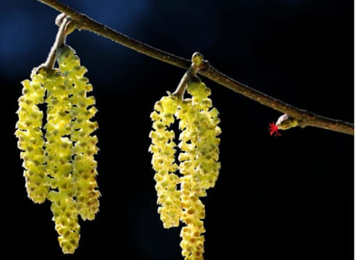 Hazel is monoecious, meaning that both male and female flowers are found on the same tree. Male flowers are pale yellow catkins. They open in February, before the leaves unfurl so they are one of the first obvious signs of spring in the forest.